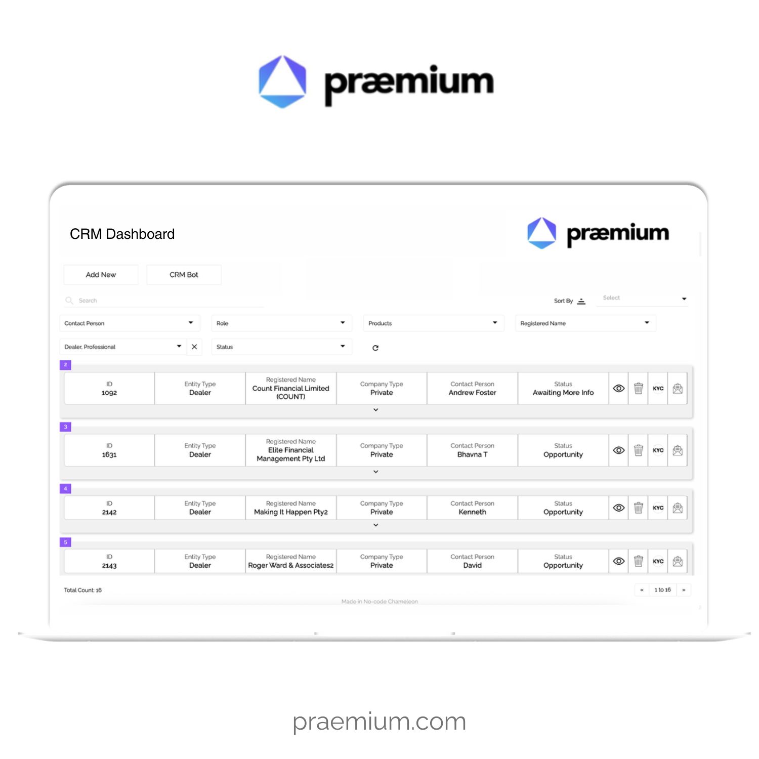 Praemium: AI-powered CRM integrated with core system Praemium, a Top 5 wrap platform in Australia, sought to empower advisers to manage expanding client portfolios, rising compliance complexity, and new revenue pathways, without increasing operational friction. In partnership with Chameleon, Praemium embedded an AI-powered CRM dashboard directly into its core platform, transforming the adviser interface into an intelligent command centre. The AI-driven dashboard delivers: Real-time, predictive insights that surface risks, opportunities, and next-best actions A fully configurable, role-based interface tailored to adviser, support, and compliance functions Unified visibility across cross-sell opportunities, client servicing, and regulatory obligations An executive-level agentic AI bot provides a continuous, high-level synthesis of CRM activity: monitoring trends, highlighting material movements, and advising on what matters most across growth, client engagement, and compliance. The result is a high-performance advisory environment where insight drives action, governance is embedded by design, and scalable growth is underpinned by intelligent infrastructure.