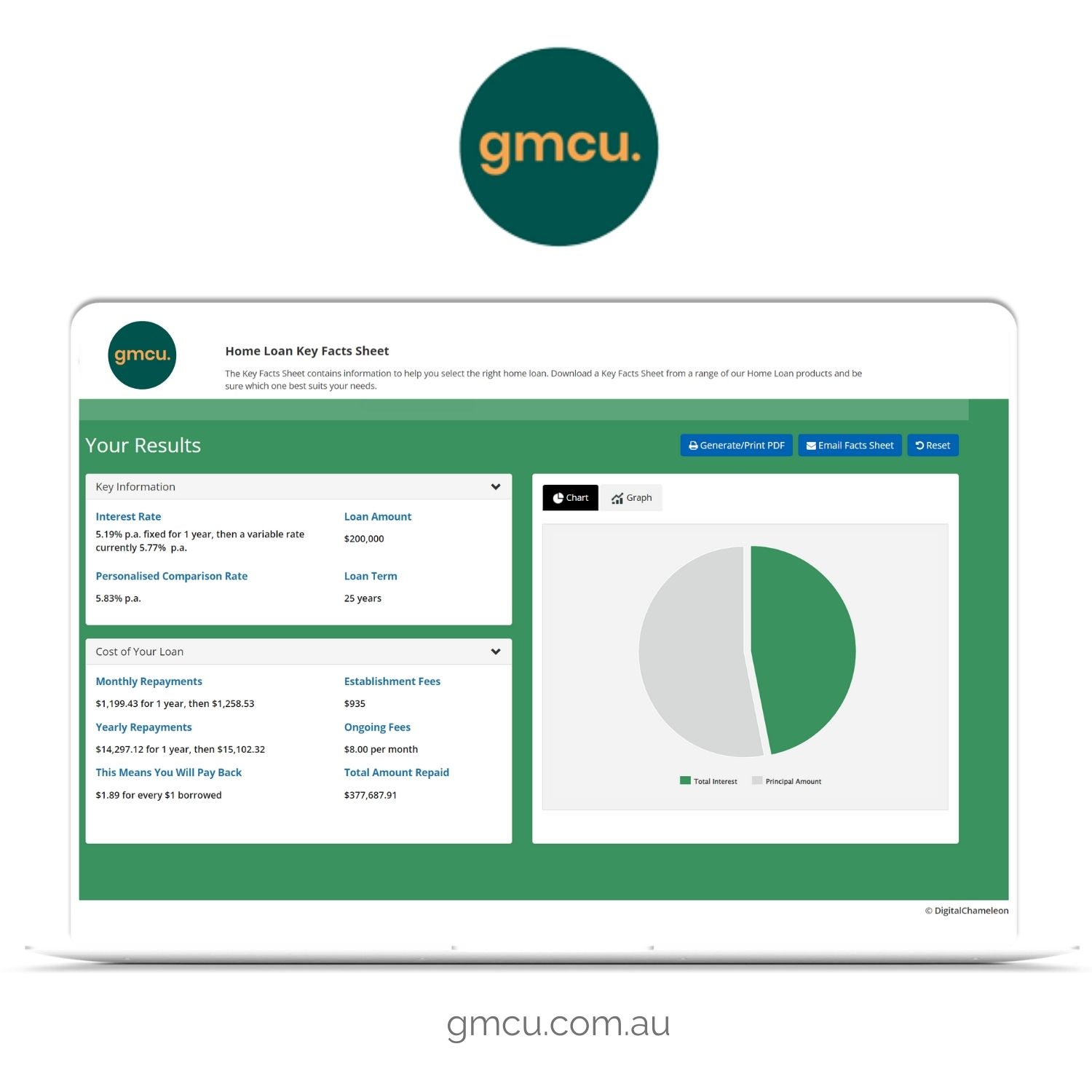 Goulburn Murray Credit Union (GMCU): Empowering Visitors with Digital Calculators GMCU enhances its website's functionality by integrating DigitalChameleon calculators, allowing visitors to perform self-calculations for their financing needs, serviceability, and taxes. DigitalChameleon's interactive Home Loan Key Facts sheet provides information including comparison rate of their home loan products in a government regulated format. This empowers visitors to make informed financial decisions.
